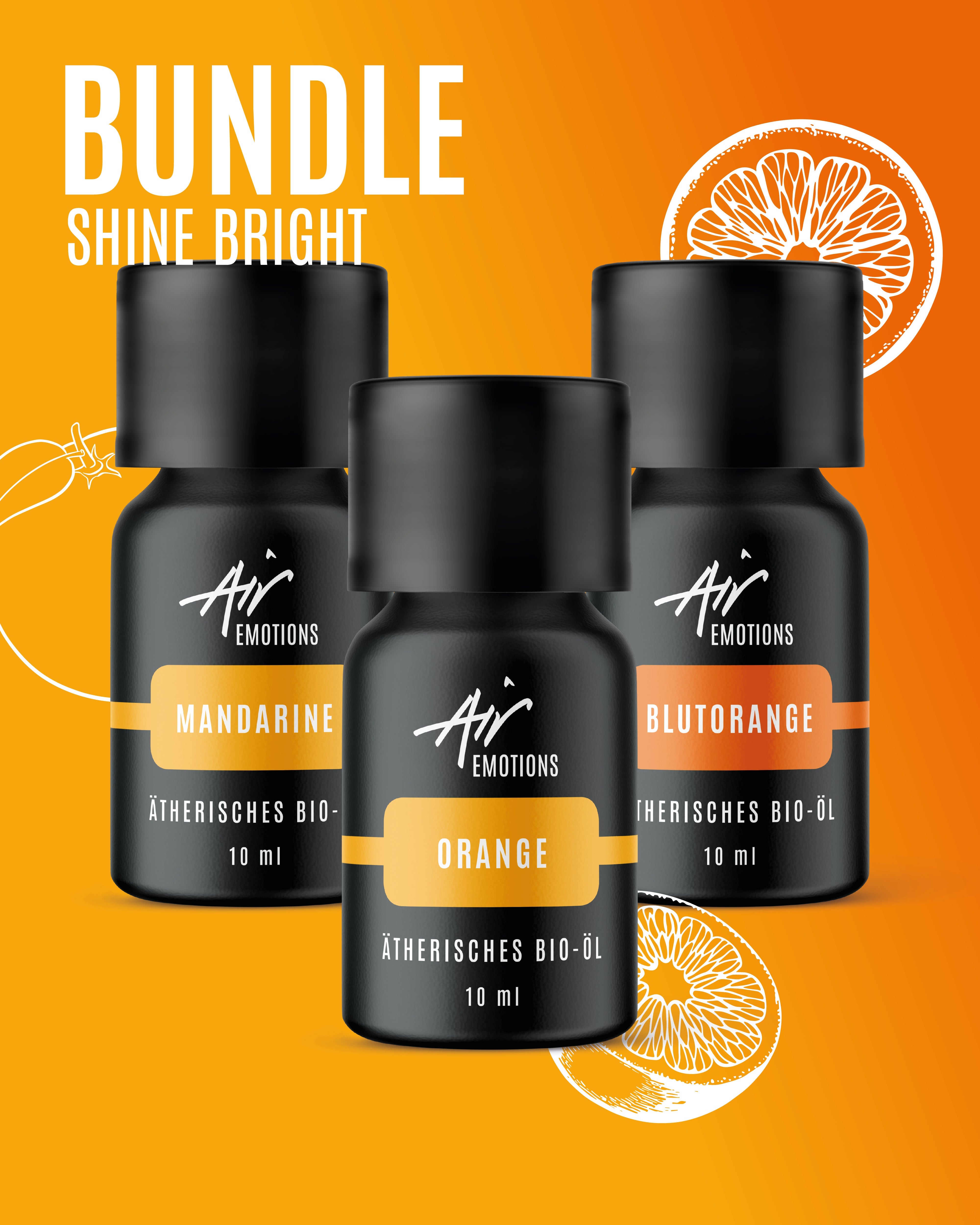 Das Shine Bright Set bringt Sonnenschein in den Alltag mit drei spritzigen Zitrusölen. Die ätherischen Öle Orange, Mandarine und Blutorange versprühen einen fruchtigen, belebenden Duft, der die Stimmung aufhellt und neue Energie schenkt. Dieses Trio ist perfekt, um Räume mit Frische zu füllen und jederzeit für gute Laune zu sorgen – ob am Morgen, im Büro oder zwischendurch.