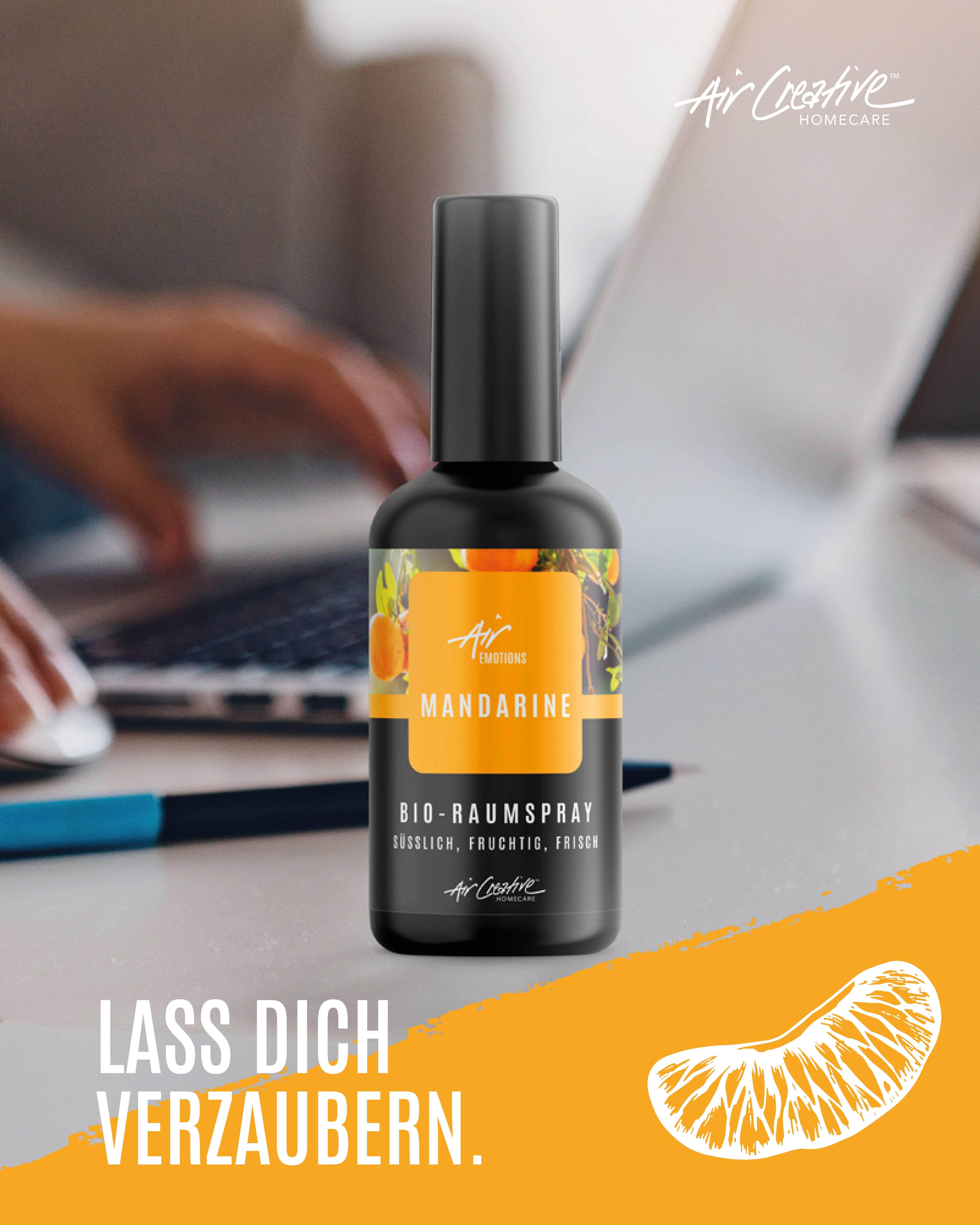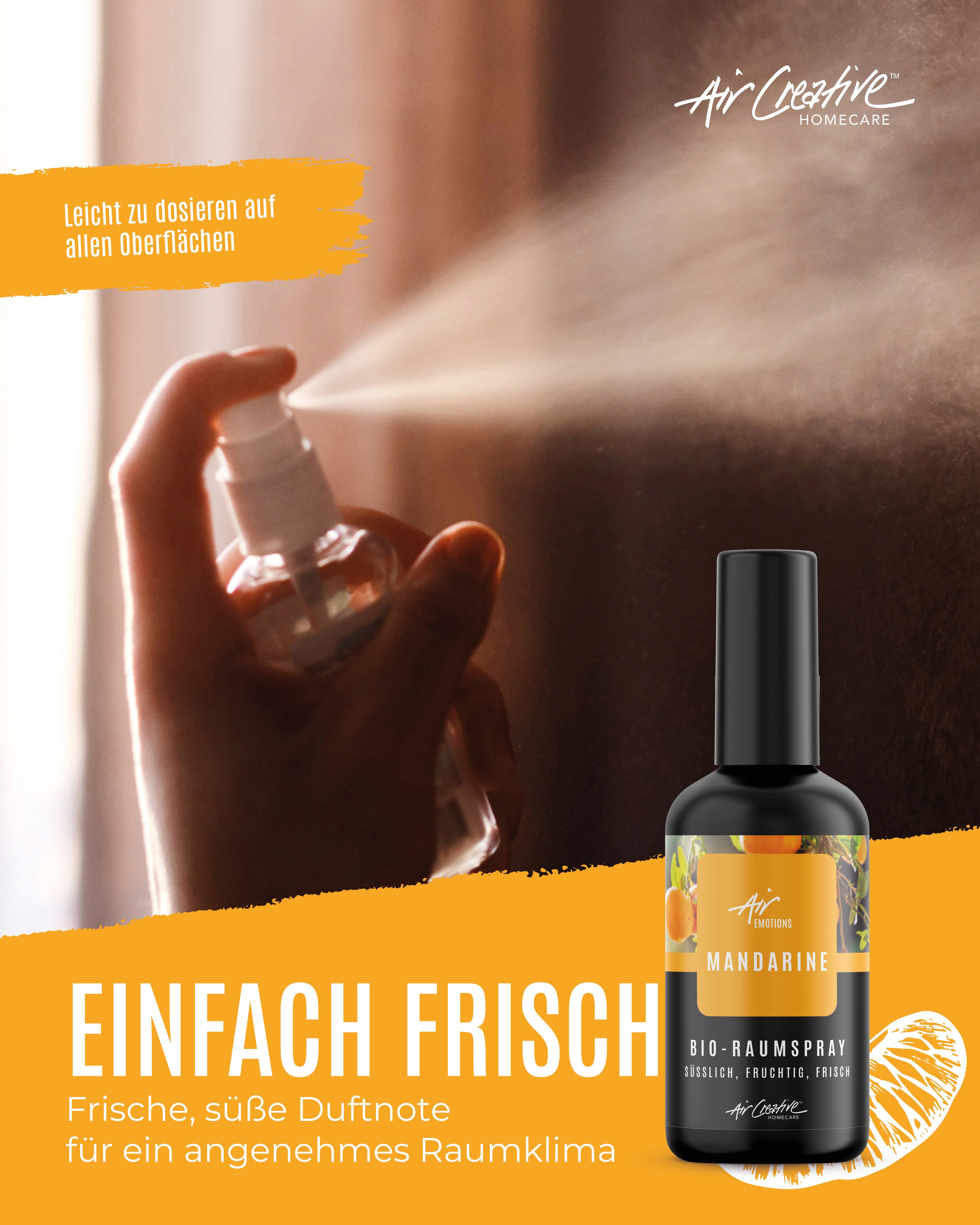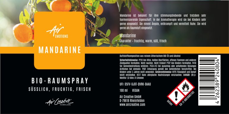 Erlebe die frische Leichtigkeit der Mandarine mit unserem AirEmotions Raumspray. Dieser Duft entführt dich auf eine Reise in sonnige Obstgärten und verbreitet eine Atmosphäre der Freude und Gelassenheit.