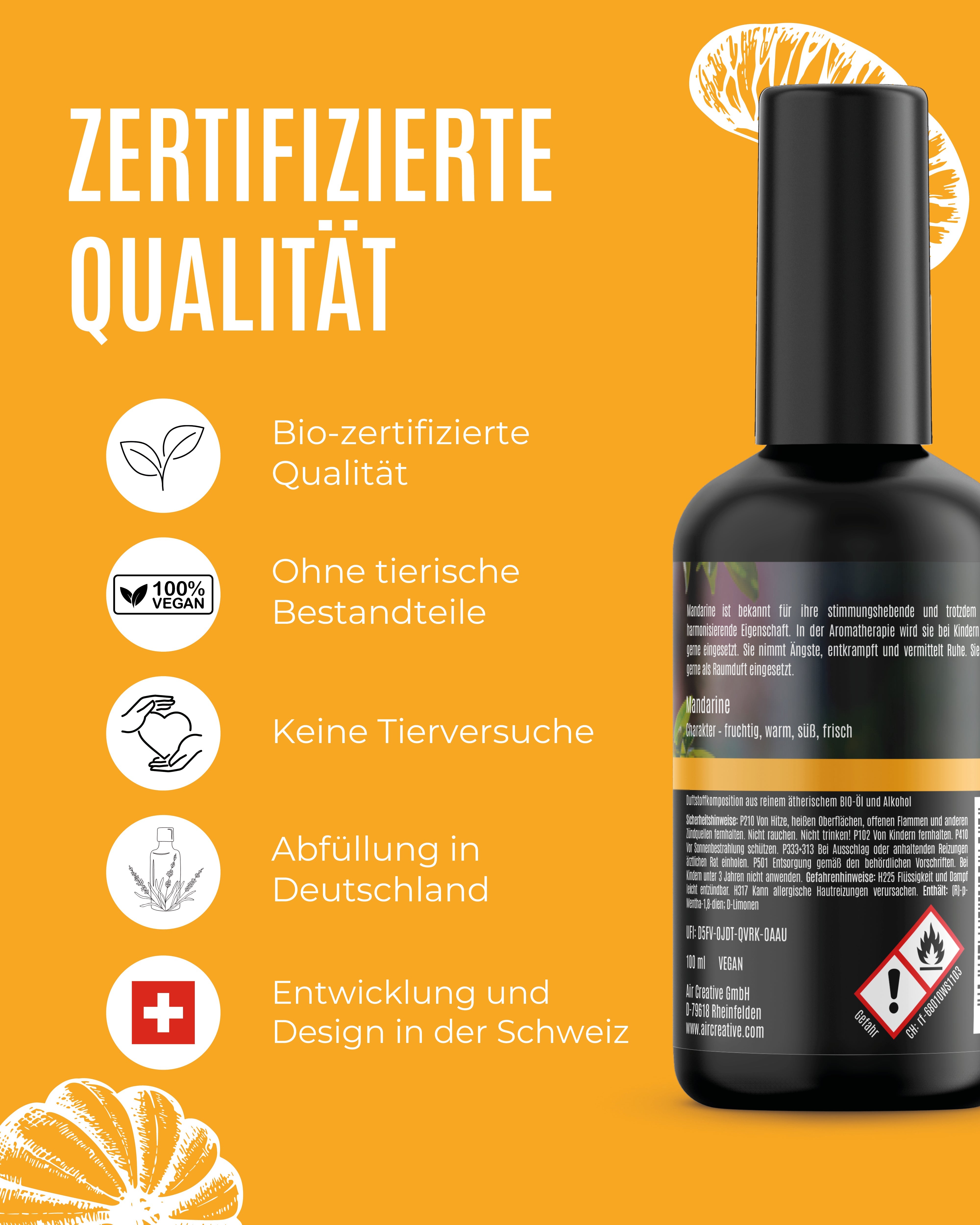 Genieße die angenehme Leichtigkeit der Mandarine, die Körper und Geist erfrischt. Der zitrusfrische Duft belebt und zaubert ein Lächeln auf dein Gesicht.