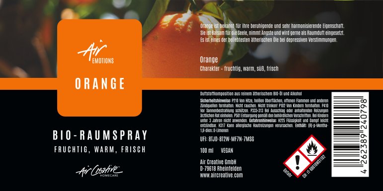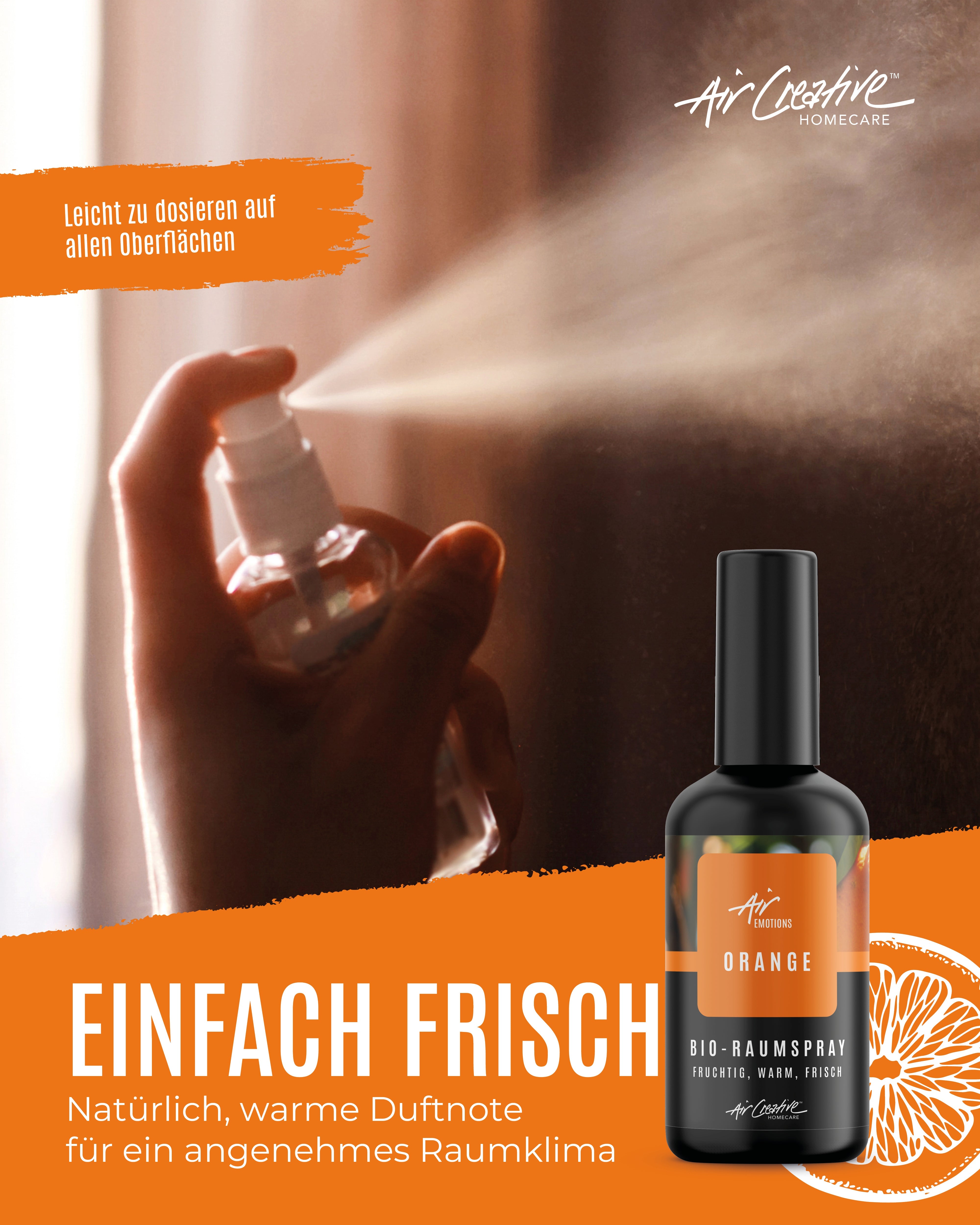 Das ätherische Öl Orange ist für seine stimmungsaufhellenden Eigenschaften bekannt. Wecke mit einem Sprühstoß Deine Sinne und hole Dir pure Lebensfreude in dein Zuhause.