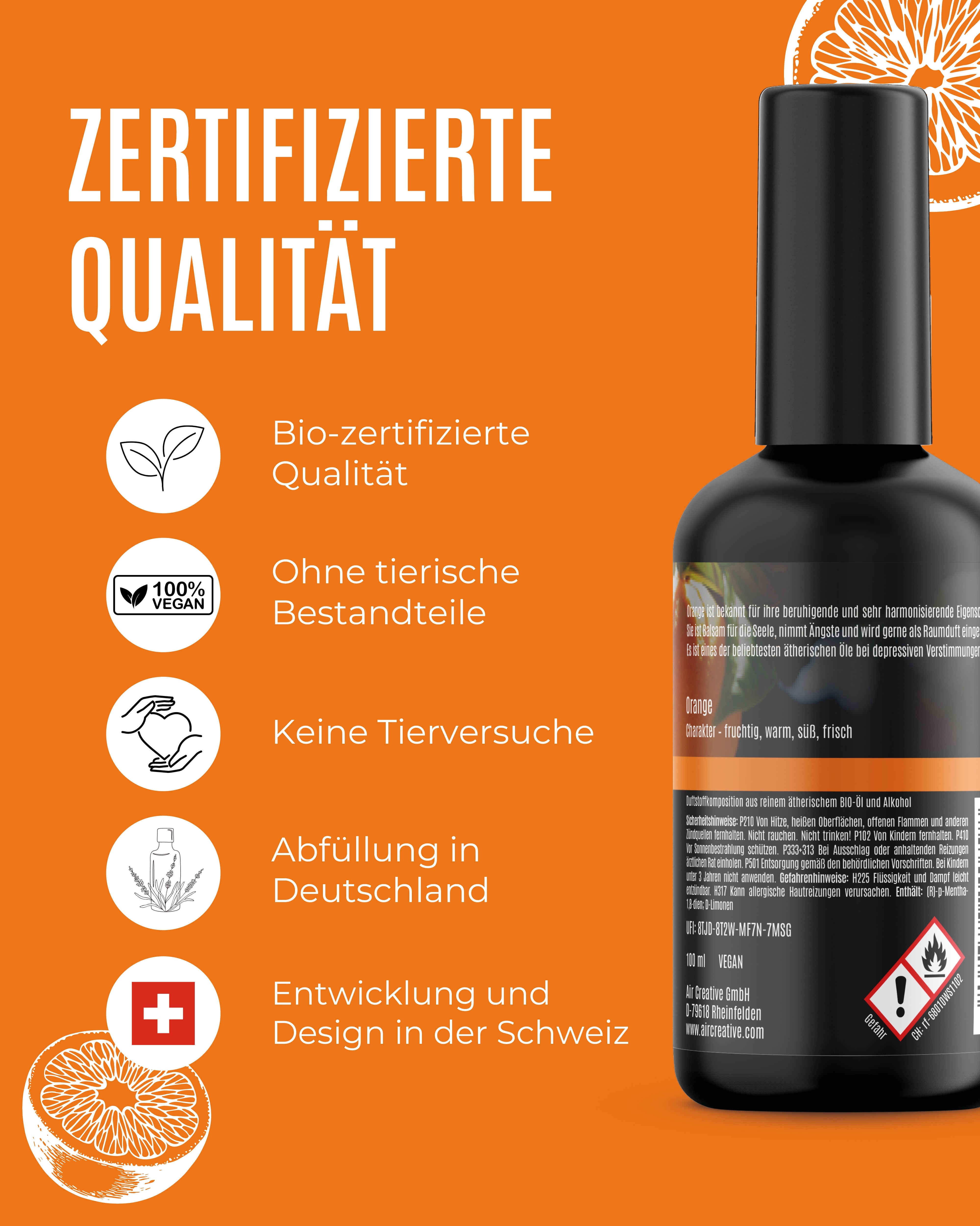 Der fruchtige, zitrusartige Duft der Orange belebt Körper und Geist. Egal, ob im Wohnzimmer, im Büro oder in Deinem persönlichen Rückzugsort – unser Raumspray mit Orange schafft eine frische und fröhliche Atmosphäre.