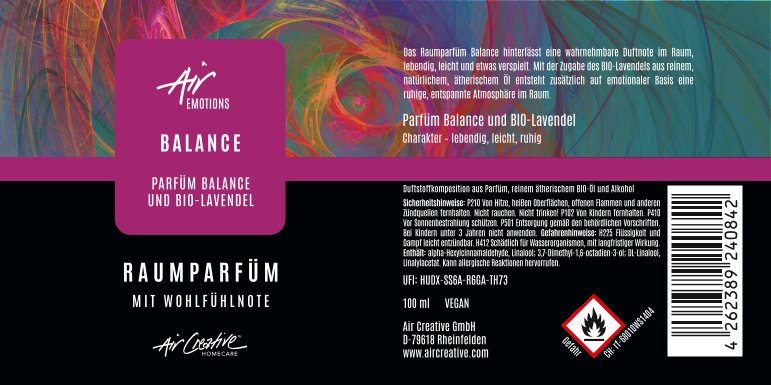 Das Raumparfüm Balance hinterlässt eine wahrnehmbare Duftnote im Raum, lebendig, leicht und etwas verspielt. Mit der Zugabe des BIO-Lavendels aus reinem, natürlichem, ätherischem Öl entsteht zusätzlich auf emotionaler Basis eine ruhige, entspannte Atmosphäre im Raum.