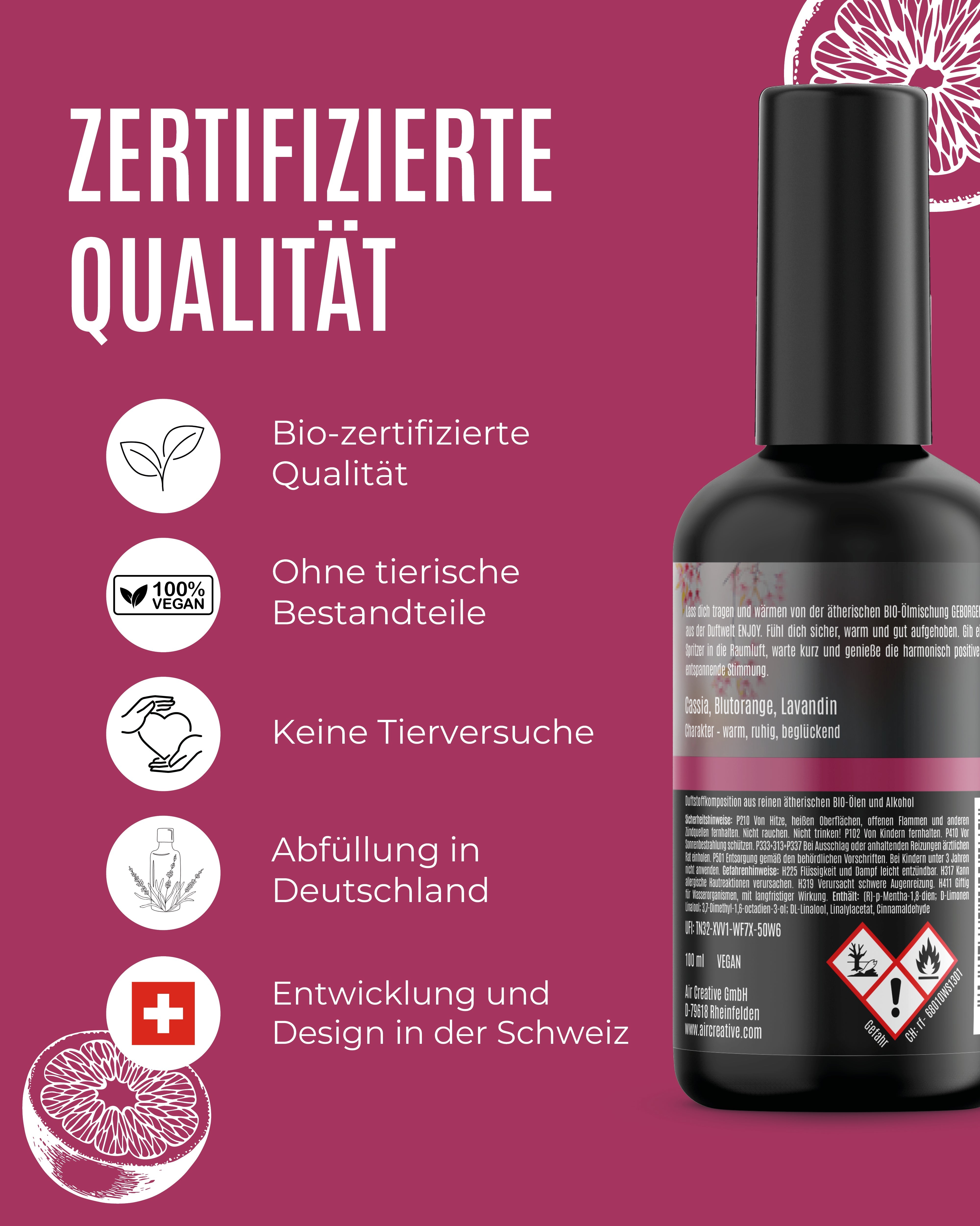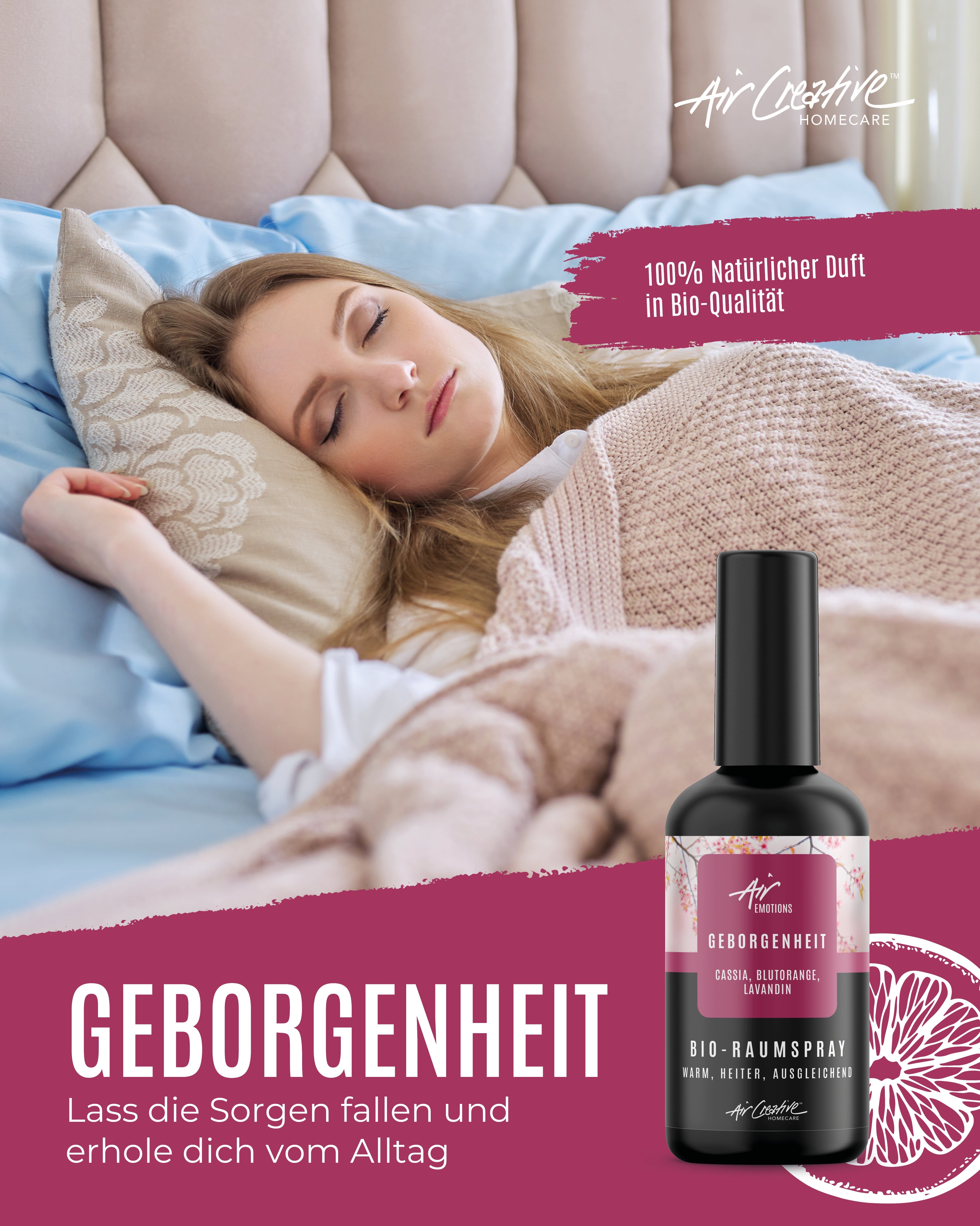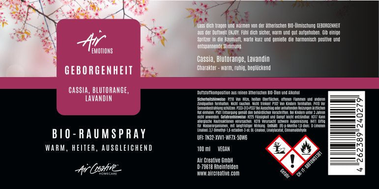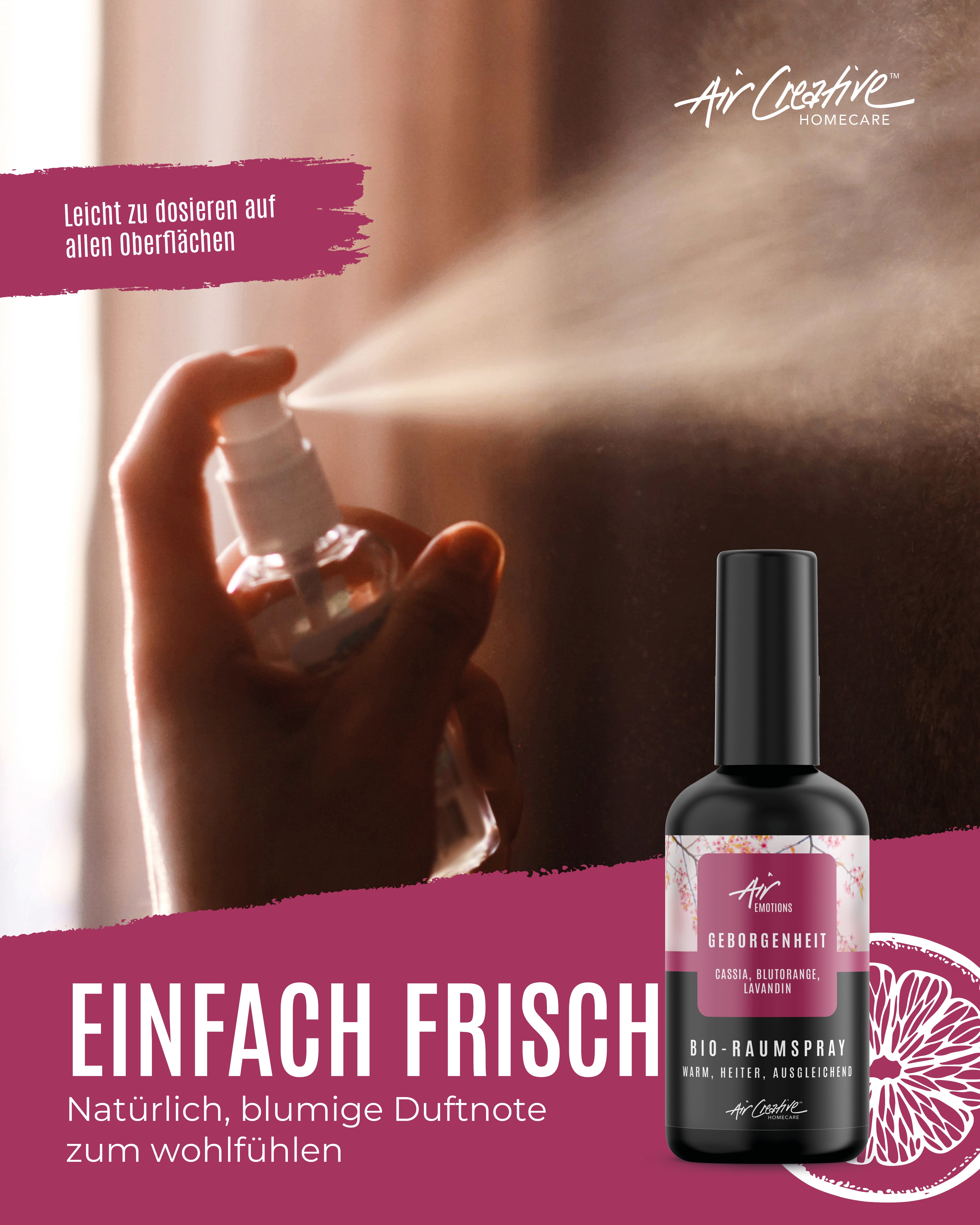 Unser AirEmotions Raumspray "Geborgenheit" vereint die herzerwärmenden ätherischen Öle von Cassia, der belebenden Blutorange und dem beruhigenden Lavandin zu einem wunderbaren Dufterlebnis.
