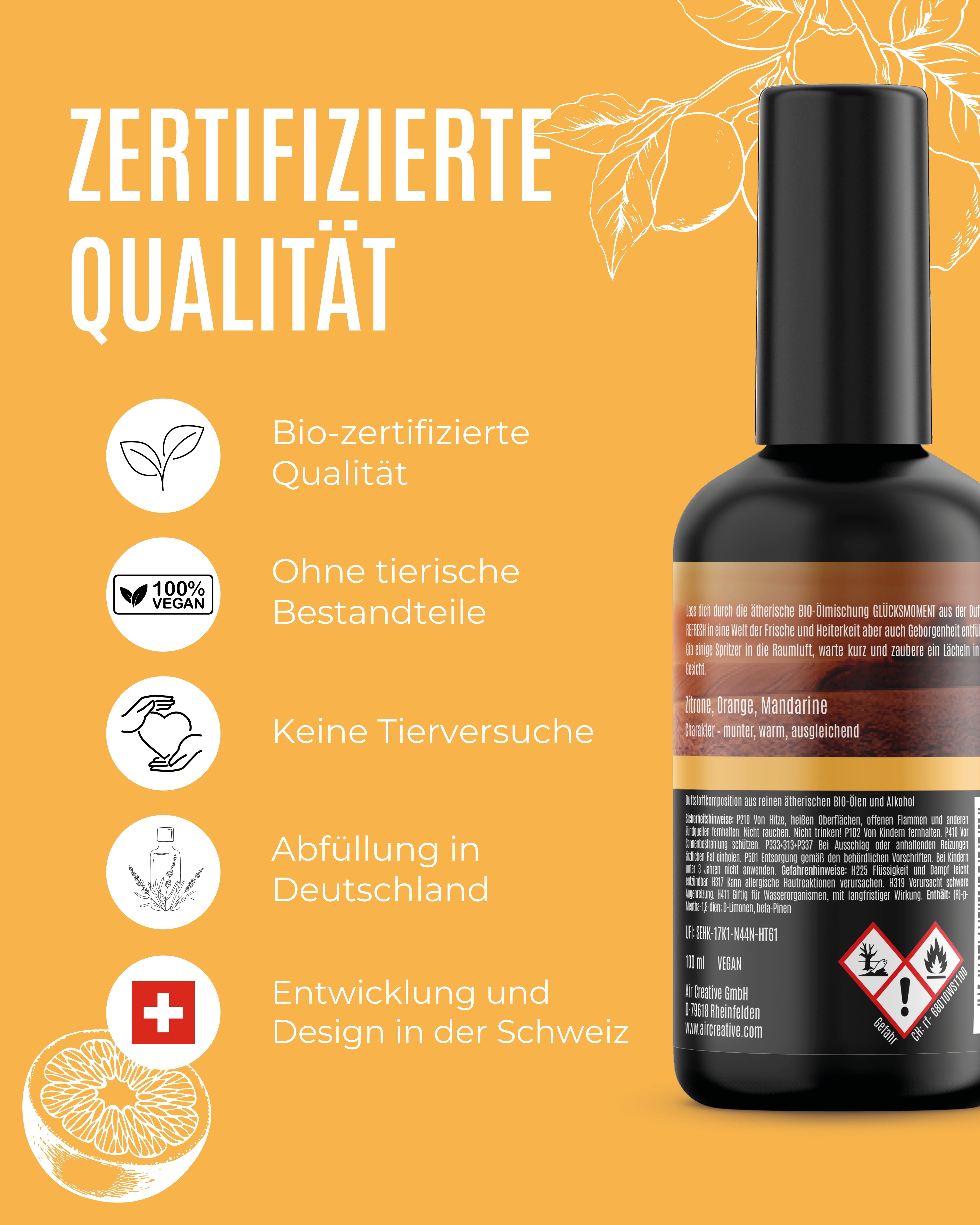 Unser Raumspray wird ausschließlich aus hochwertigen ätherischen Bio-Ölen hergestellt, die in deiner Umgebung einen sanften und erfrischenden Duft hinterlassen. Genieße die natürliche Frische und die belebende Wirkung der Zitrusdüfte.