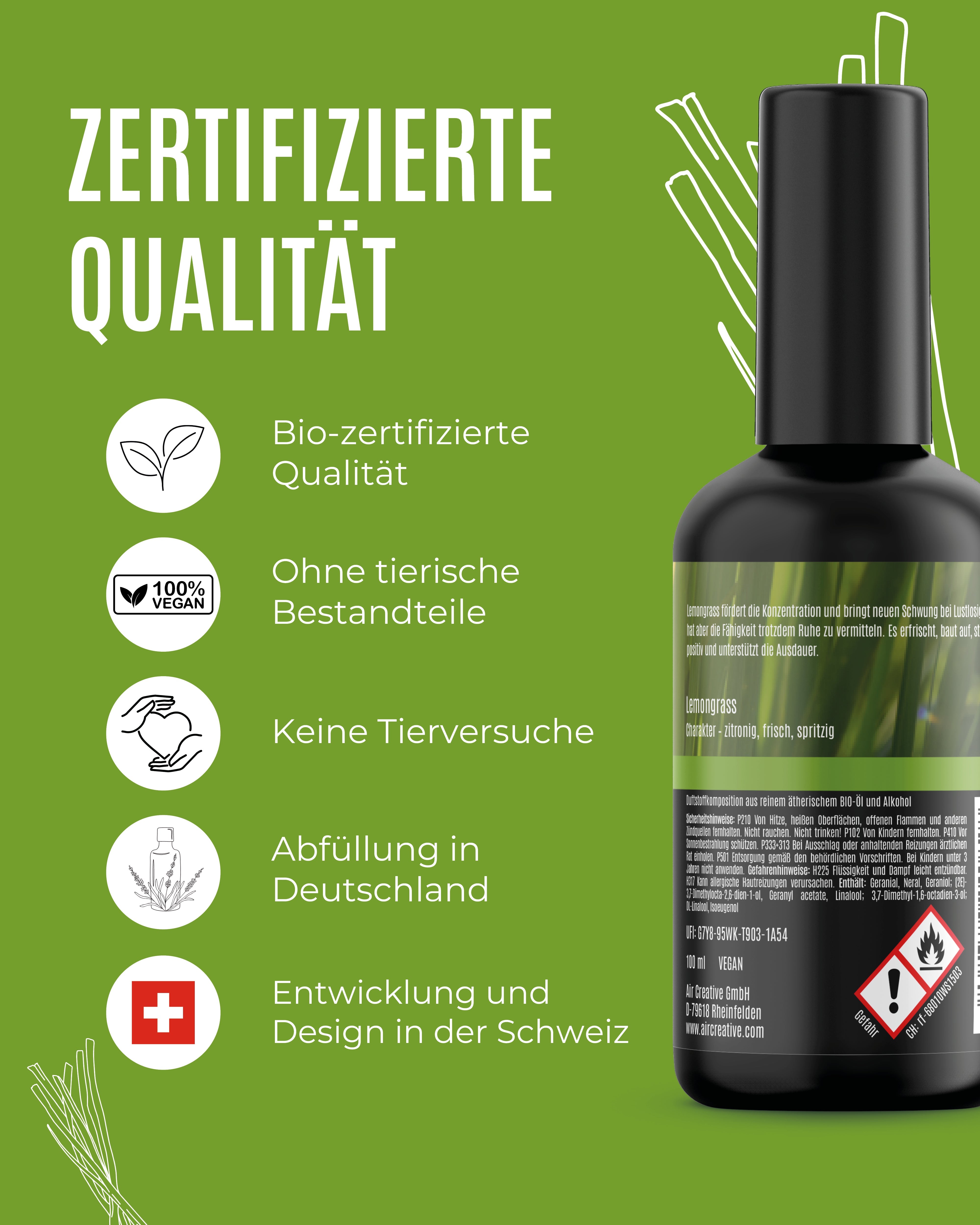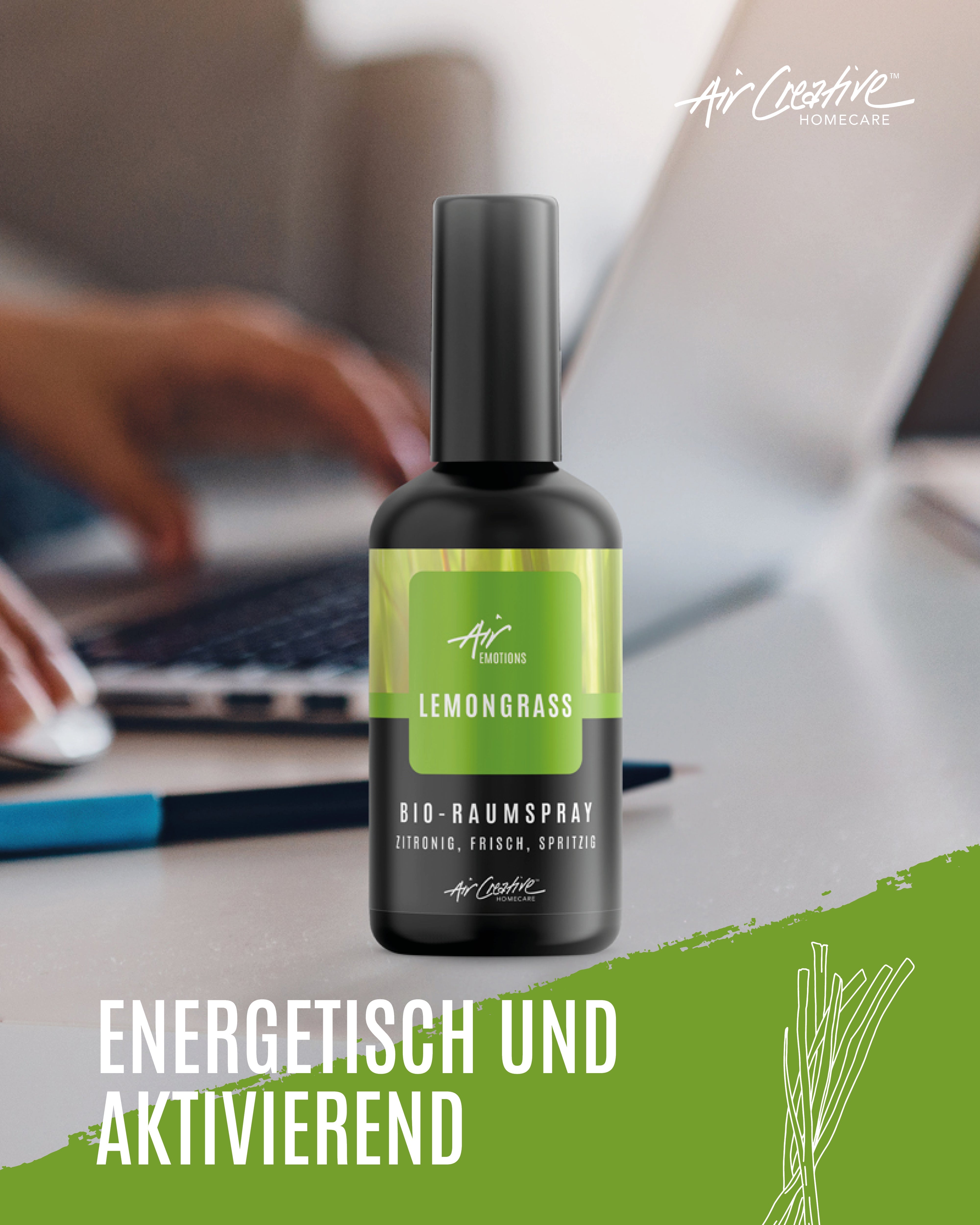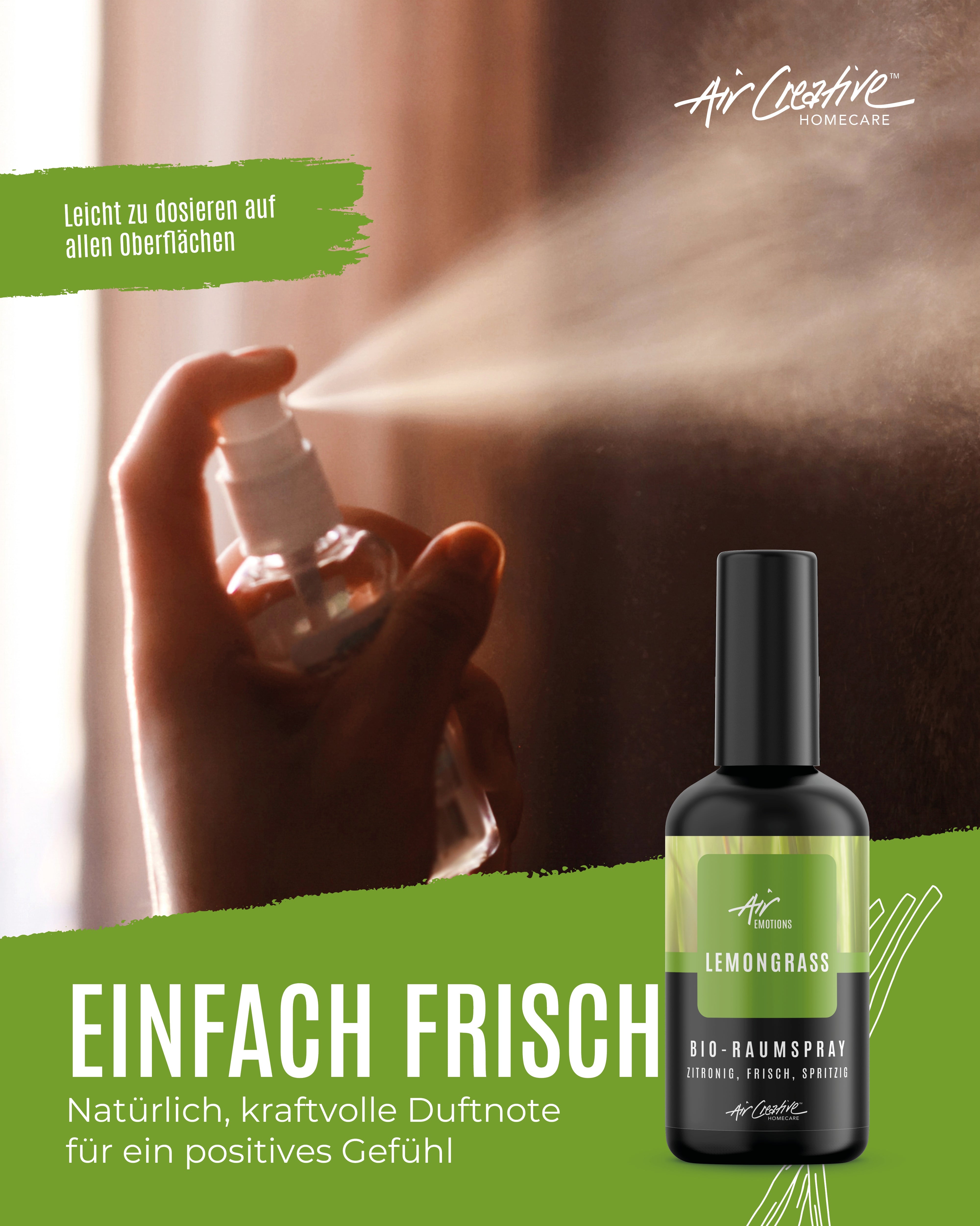 Unser Raumspray mit reinem ätherischen Öl Lemongrass fördert die Konzentration und bringt neuen Schwung bei Lustlosigkeit, hat aber die Fähigkeit trotzdem Ruhe zu vermitteln. Es erfrischt, baut auf, stimmt positiv und unterstützt die Ausdauer.